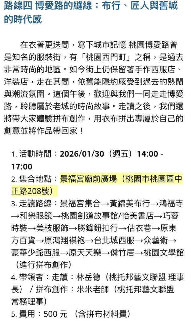 在2026.1.30這天,參加桃園文學館辦的走讀:「博愛路的縫線:布行、匠人與舊城的時代感」,由桃托邦藝文聯盟的林岳德老師帶我們認識有「桃園西門町」之稱的博愛路。