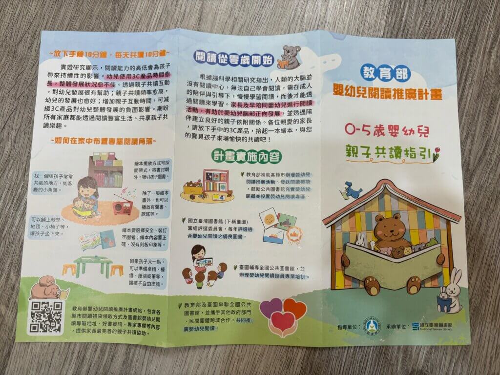 到圖書借還書還書,順手拿了「0-5歲嬰幼兒親子共讀指引」,政府提倡「從零歲開始的閱讀」,鼓勵家長從小親子共讀,公共圖書館也開始設置嬰幼兒閱讀專區。