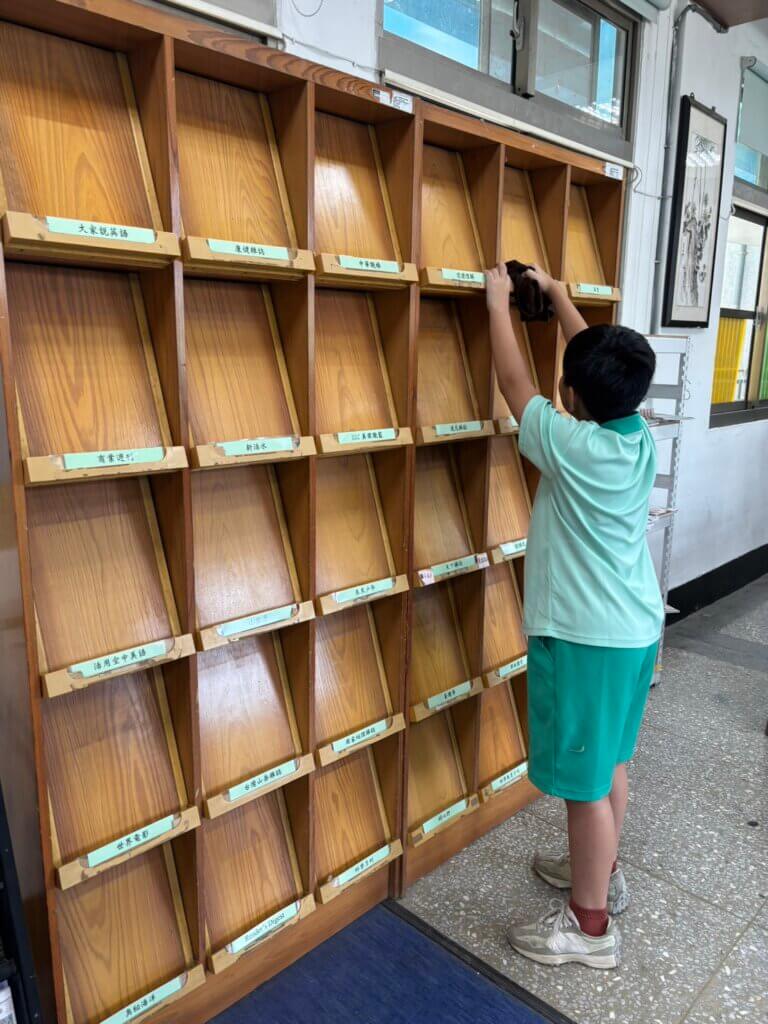 過了一個暑假,圖書館難免處處積灰塵。利用午休時間,請小志工把雜誌一一取下,進行較完整的打掃。