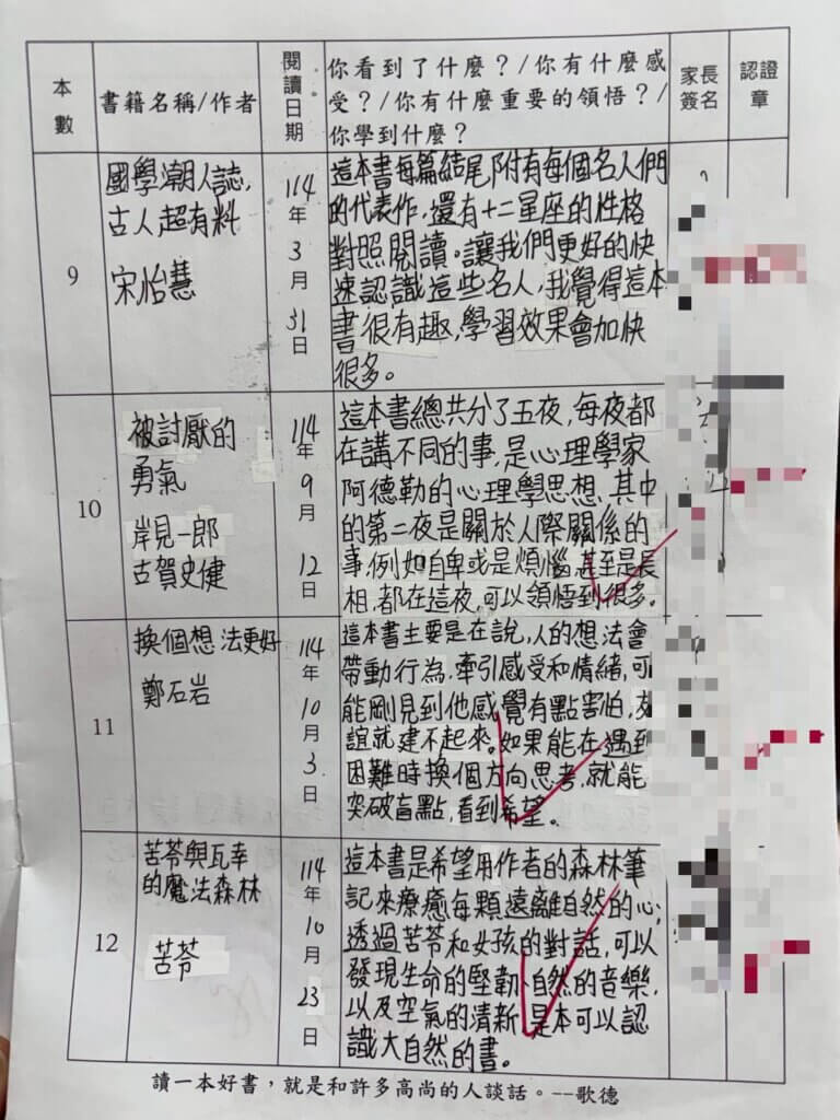 第三、敝校有些孩子,從小沒有養成閱讀習慣,遑論寫閱讀心得。寫得好壞暫且不論,透過集體力量養成習慣,一學期寫四篇閱讀心得加一篇剪報學習單,算是合理的底線。(敝校也鼓勵行有餘力的學生自己多寫,會有個人獎勵)