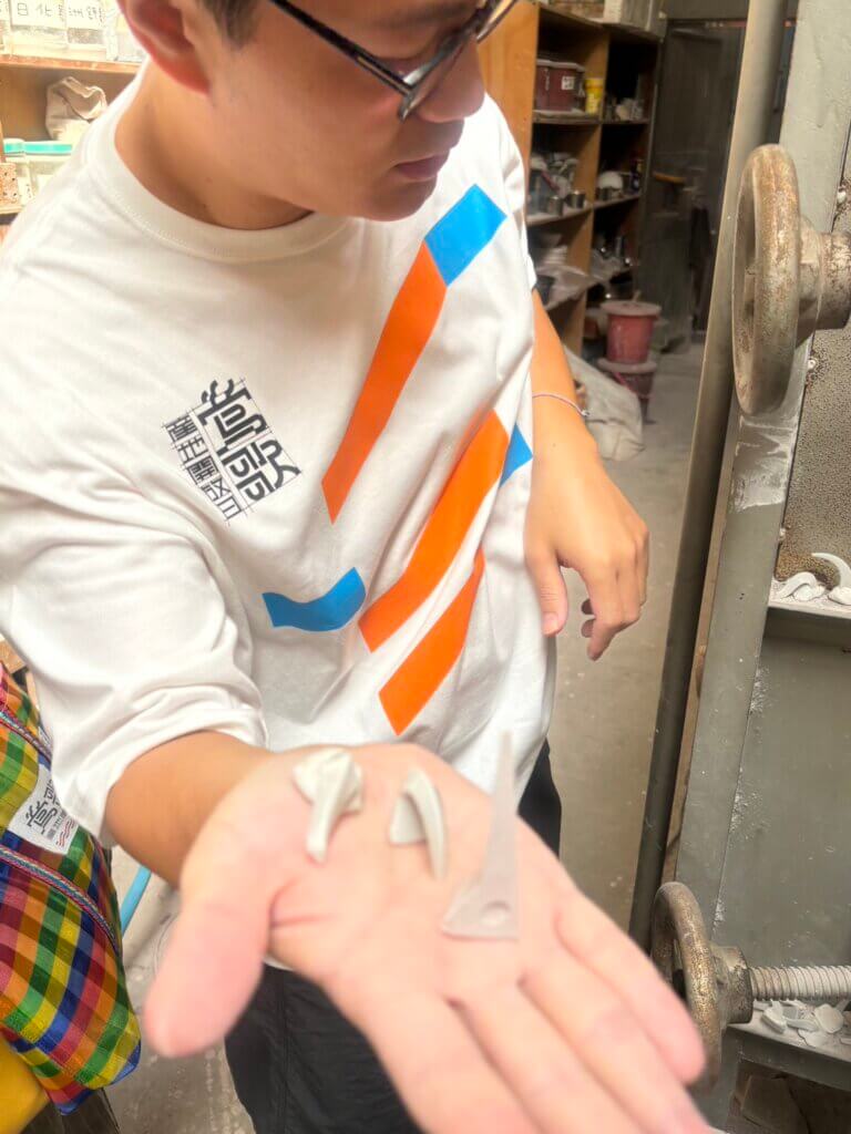 老闆展示並說明測溫錐。從本來是直立狀態,藉由觀察測溫錐彎曲狀態,可以隨時調整窯燒的溫度。