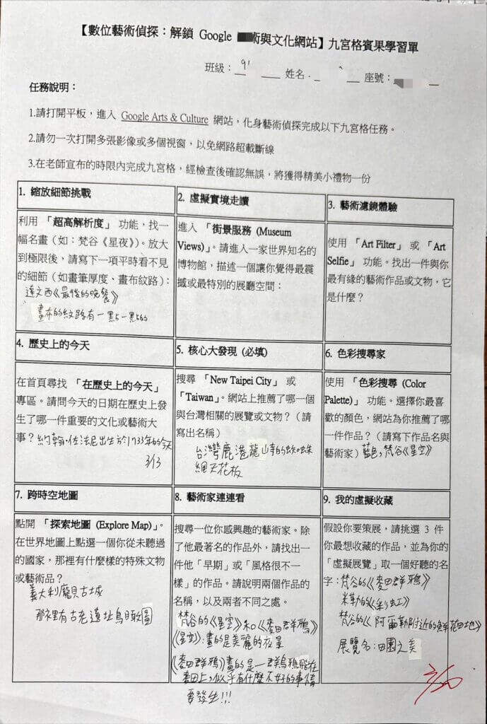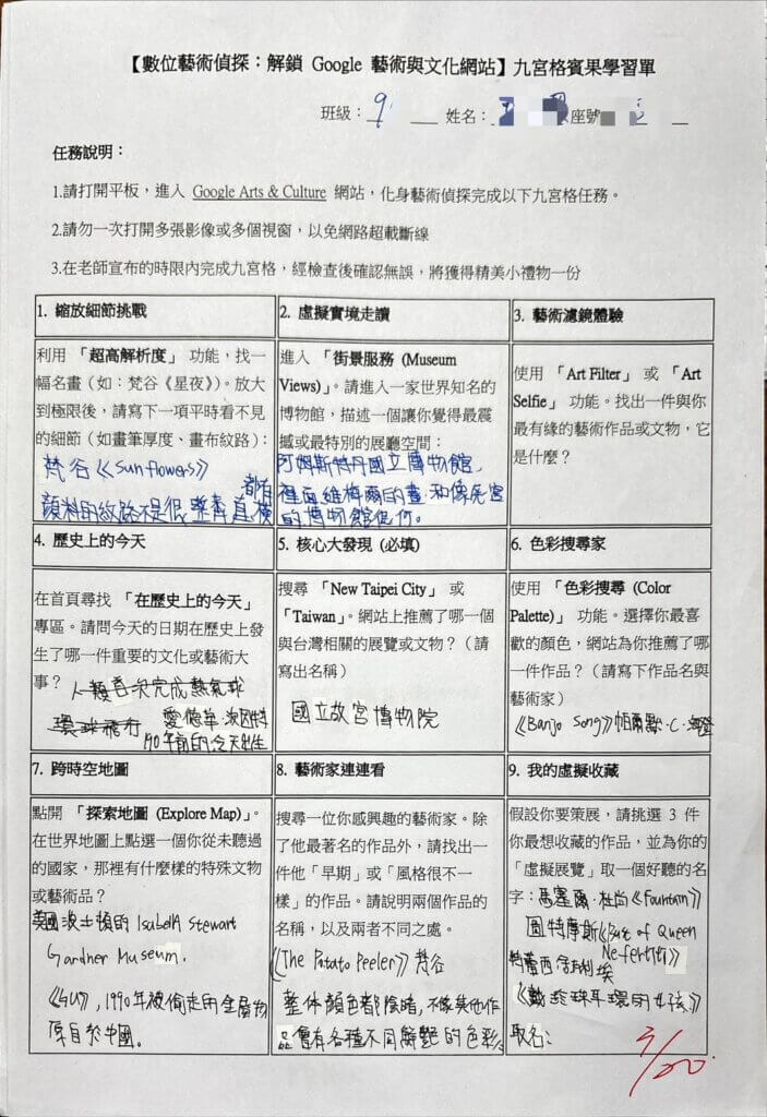 首先一起觀看影片,學習怎麼使用這個酷酷的網站,接著發下 數位藝術偵探:解鎖google藝術與文化網站 九宮格賓果學習單,讓學生各自使用平板進入網站觀看。