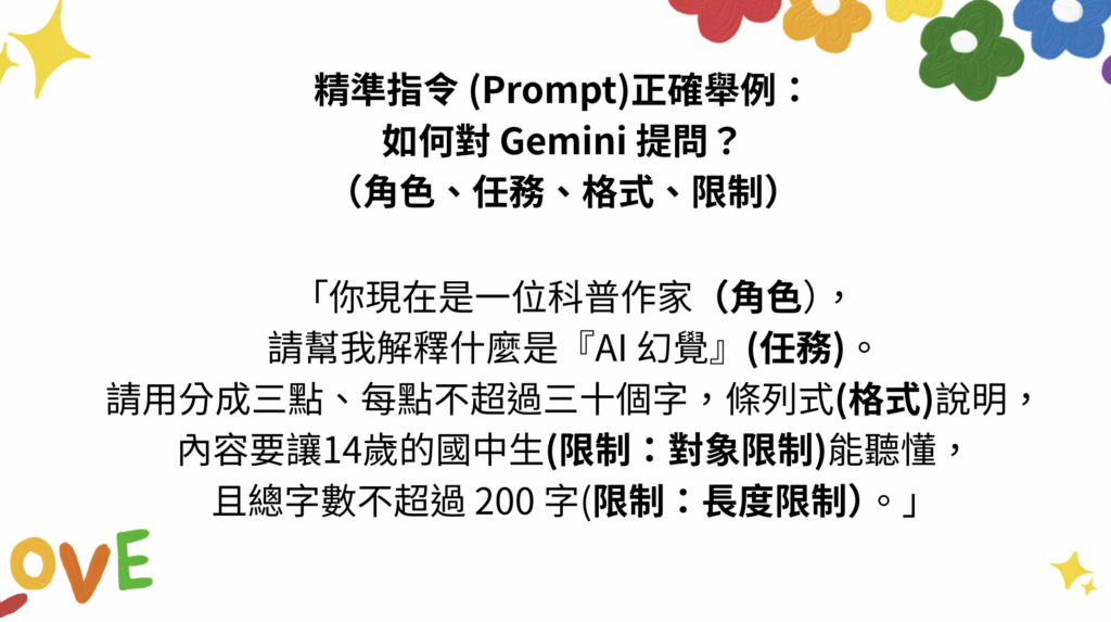 先用簡報向學生說明,提問要包含「角色、任務、格式、限制」。