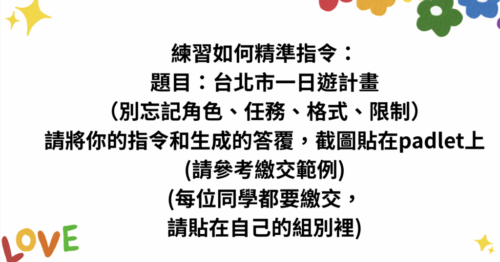 看完正確和錯誤指令和產出答覆後,請學生練習自己下指令,並把過程截圖貼在padlet上。