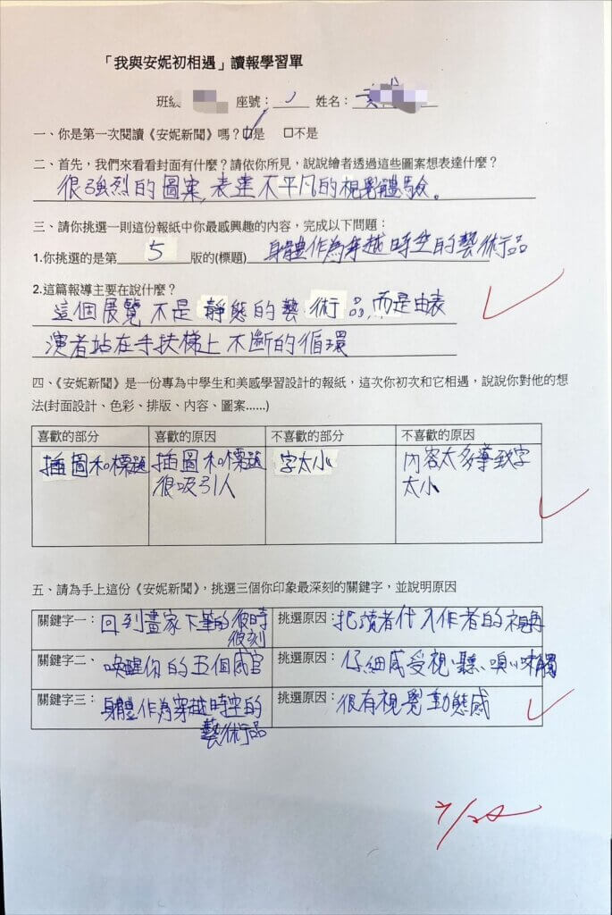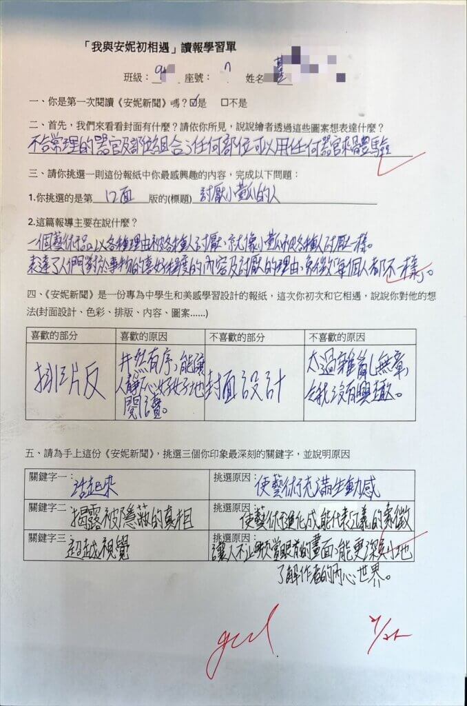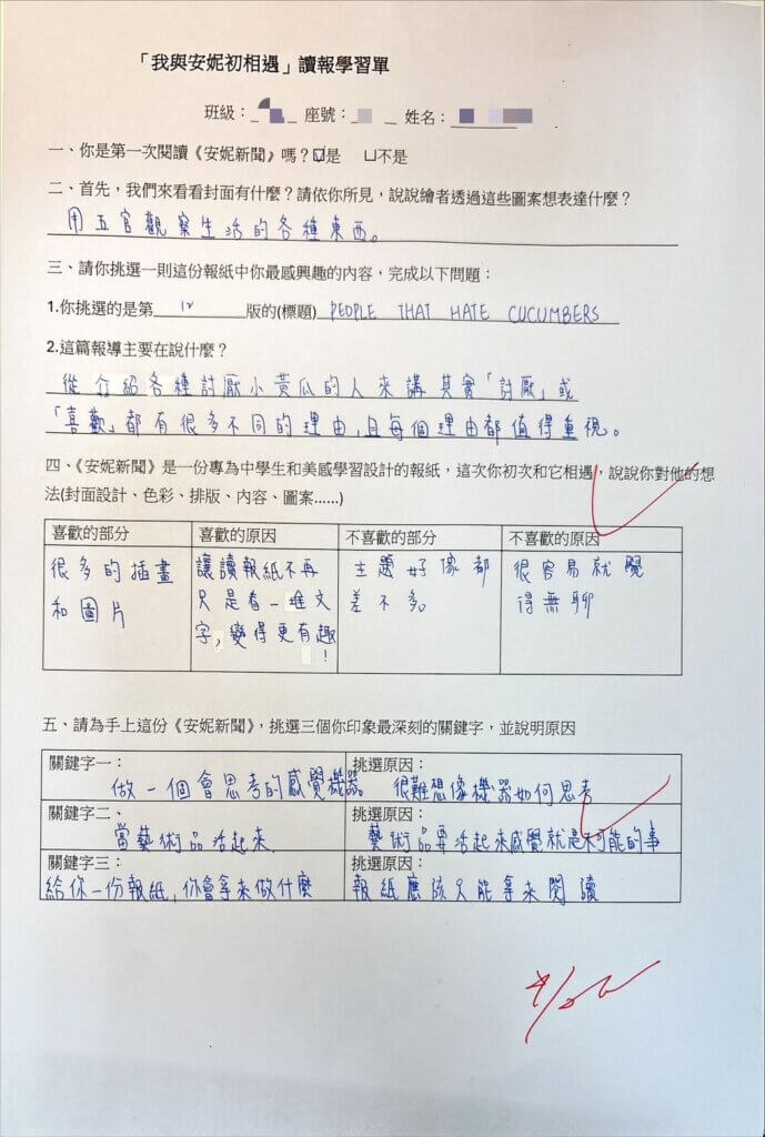 學生的寫字速度有落差,但大致上都能在十五分鐘內初步翻閱安妮新聞,並完成學習單。