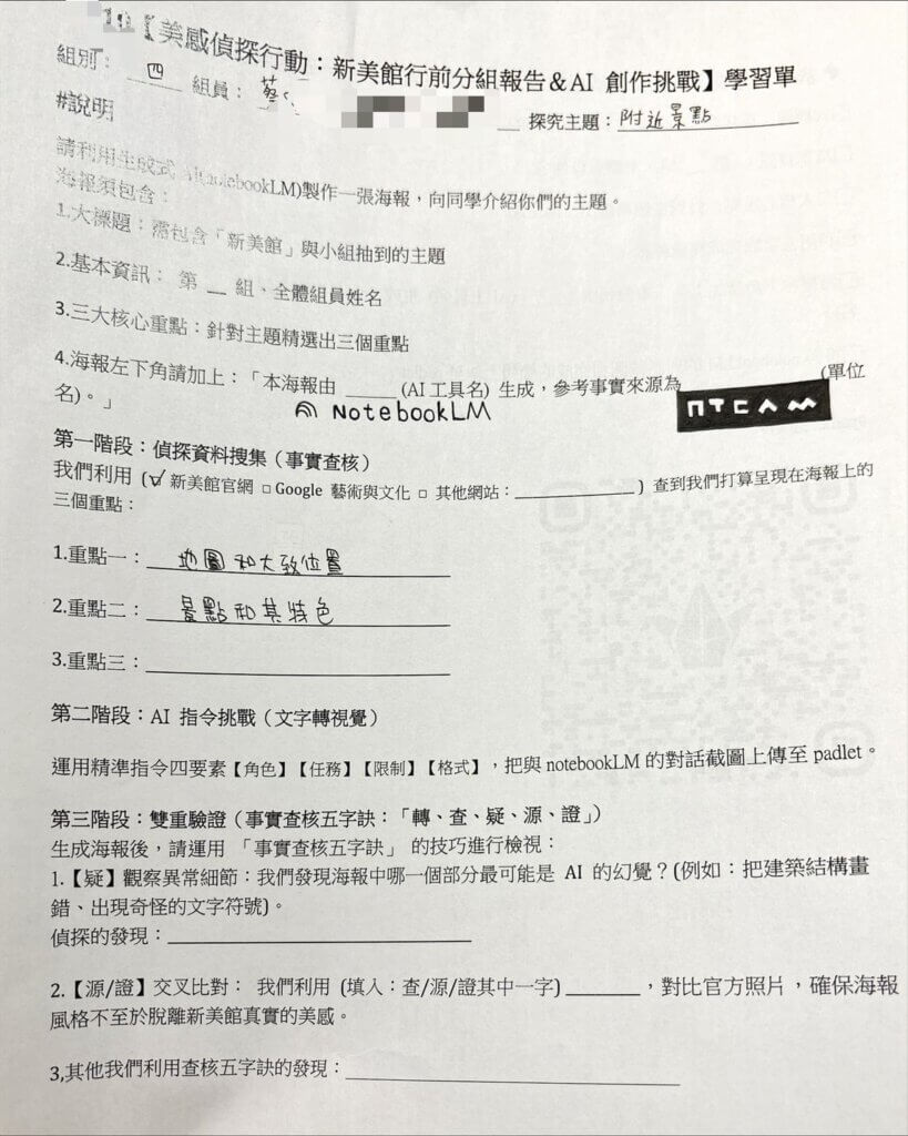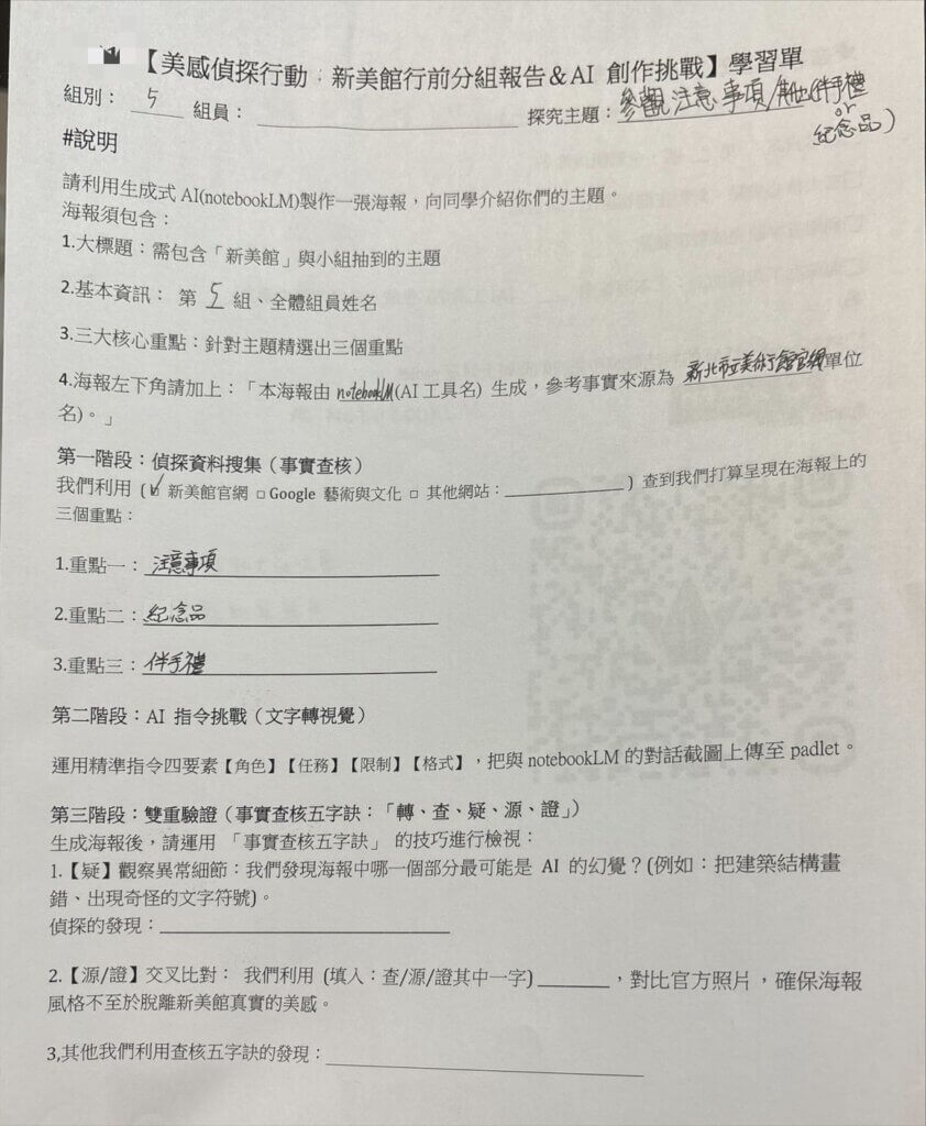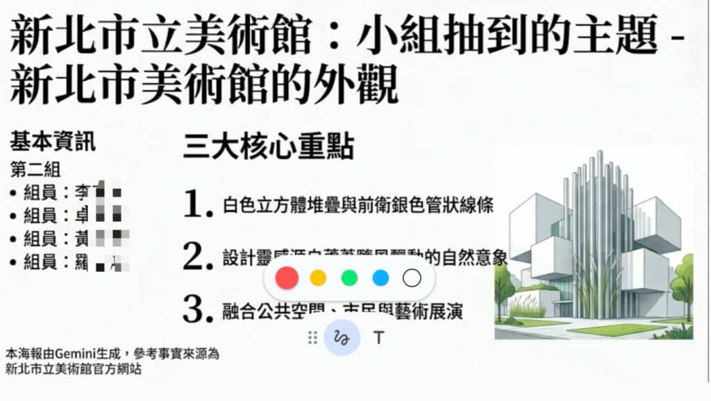 這節課請同學利用notebookLM,根據【美感偵探行動:新美館行前分組報告&AI 創作挑戰】學習單,生出一張該組負責主題的簡報。簡報上必須包含大標題、基本資訊、三大核心重點、標注參考事實來源等等。