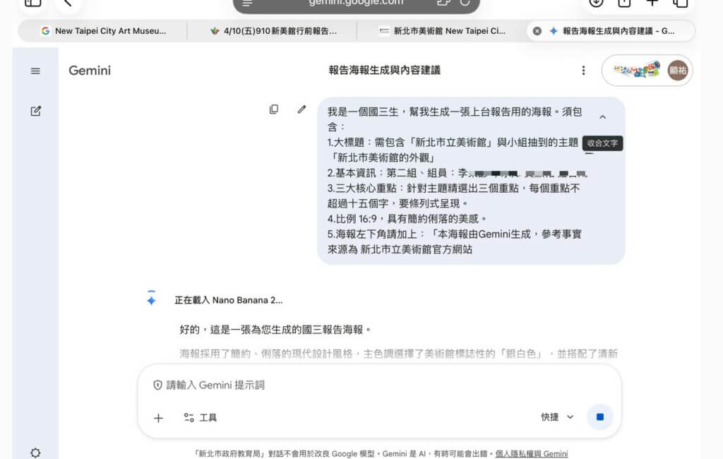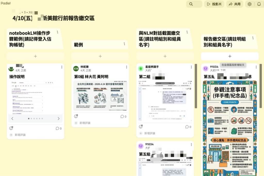 這堂課是4/24參訪新北市立美術館前的最後一堂課,學生要利用AI完成行前分組報告。