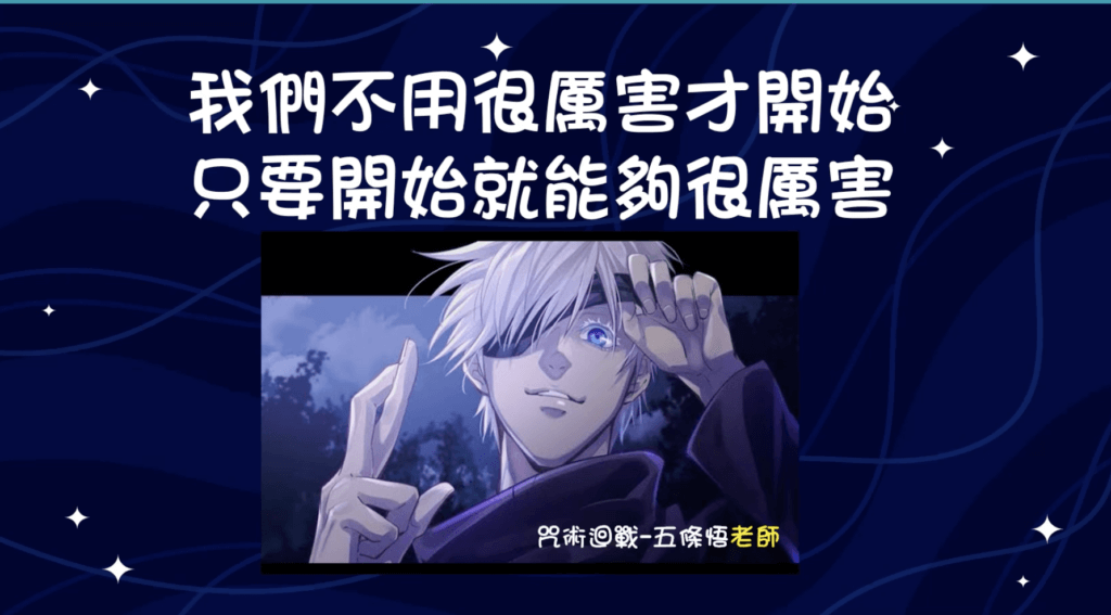 下圖是嘉琪老師的其中一張簡報,希望我們也能成為像五條悟老師一樣,給予學生足夠支持和安全感的老師。