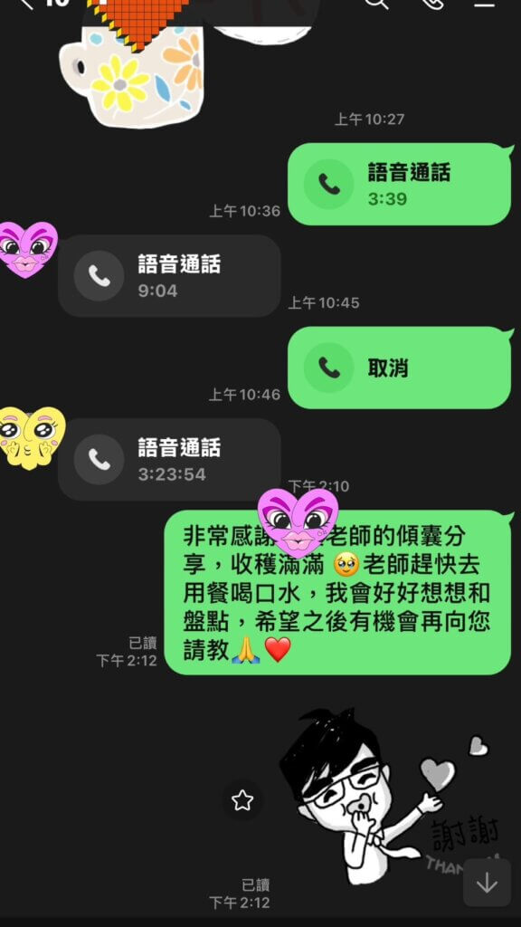 鼓起勇氣寫信給主辦單位,表達有些問題想請教這位老師。感謝主辦單位的牽線,老師很樂意提供協助,也交換了line,本來老師爽快表示「你的問題幾分鐘可講完」,沒想到是超過3.5小時的通話,感動到覺得太魔幻了(為避免造成這位熱心老師的困擾,這篇文章隱去可識別細節)